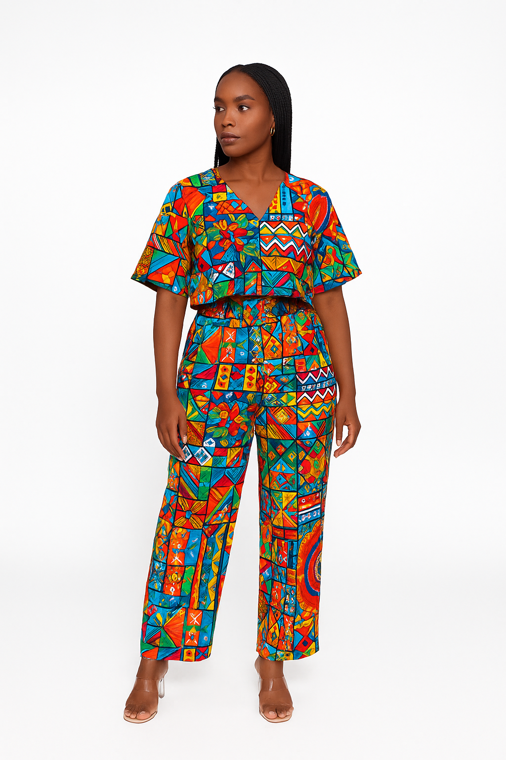 Stand out in our Ankara V-Neck Two-Piece Set featuring the bold Multicolor Tribal Patchwork print. This premium co-ord combines a relaxed-fit cropped V-neck top with wide-leg, high-waist trousers. The vibrant floral pattern patchwork of geometric and tribal-inspired patterns in red, green, yellow, and blue creates a unique look that’s perfect for cultural events, festivals, or statement everyday wear.