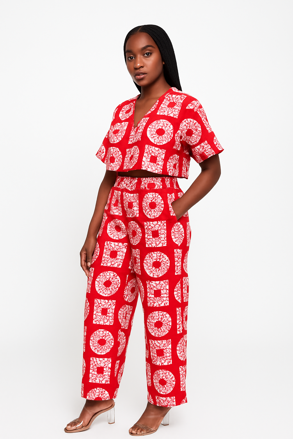 Step into vibrant elegance with our Crimson Horizon Ankara V-Neck Two-Piece Set in a striking red geometric tribal print. Designed with 100% premium cotton Ankara, this co-ord set features a cropped V-neck top and wide-leg, high-waist trousers. The bold crimson red base is decorated with abstract white circular and square tribal motifs, offering a modern yet traditional African-inspired look. Perfect for cultural events, weddings, or statement everyday fashion.